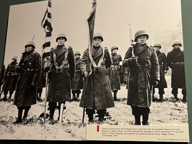 Among all challenges the Nisei soldiers had was their physical size. Most were only my size, just a little taller at about 5 feet 4 inches and about 130 lbs (my desired weight!). One display shows the uniform of the average US soldier vs. the average Nisei US soldier. This uniform comparison looked like an adult and child, vs. adults of 2 sizes, so much so that the Nisei soldiers were known as “little iron men.”